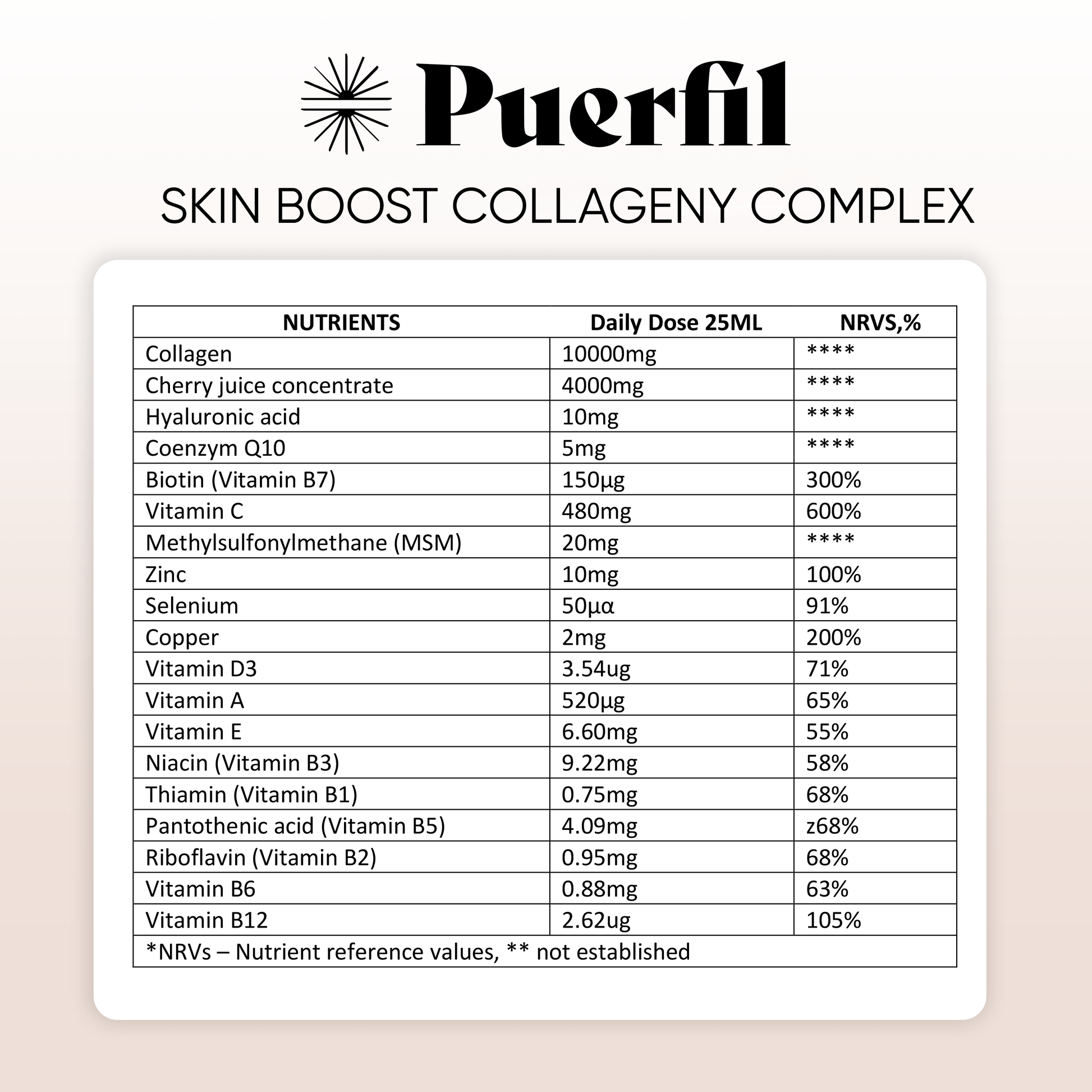 Apă, colagen de pește hidrolizat, concentrat de suc de cireșe, fructoză, acid L-ascorbic (vitamina C), regulator de aciditate: acid citric, bisglicinat de zinc, aromă de cireșe, conservanți (sorbat de potasiu, benzoat de sodiu), metilsulfonilmetan (MSM), acid hialuronic, nicotinamidă (niacină), DL-alfa-tocoferol (vitamina E), D-pantotenat de calciu (acid pantotenic), coenzima Q10, gluconat de cupru, riboflavină (vitamina B2), clorhidrat de piridoxină (vitamina B6), mononitrat de tiamină (vitamina B1), acetat de retinil (vitamina A), D-biotină, colecalciferol (vitamina D), cianocobalamină (vitamina B12), selenit de sodiu.