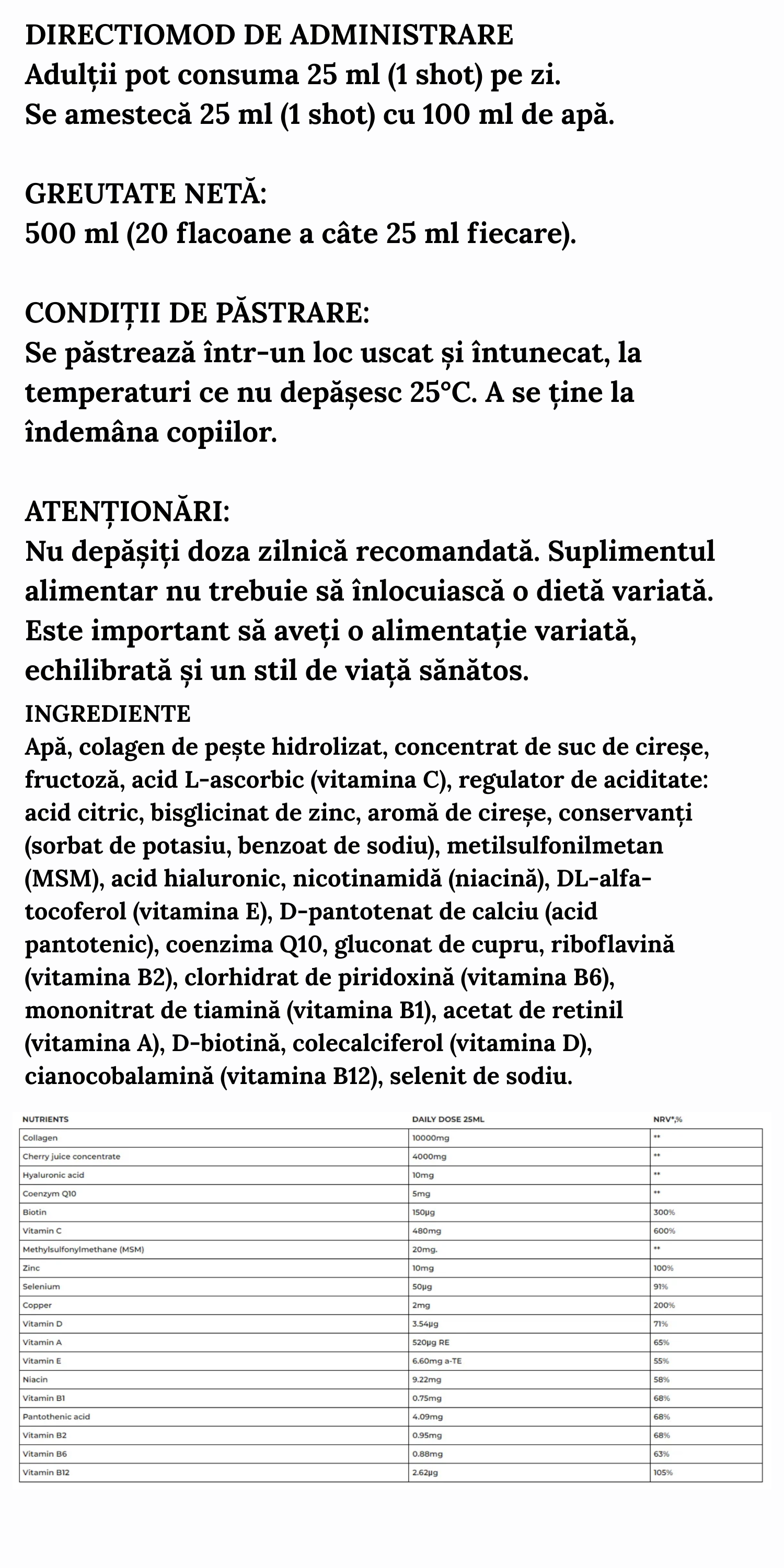 Toate injecțiile trebuie agitate înainte de utilizare. Puerfil Skin Boost Collagen Complex este un supliment lichid care trebuie băut direct din sticlă. De asemenea, este recomandat să îl utilizați în prima jumătate a zilei.